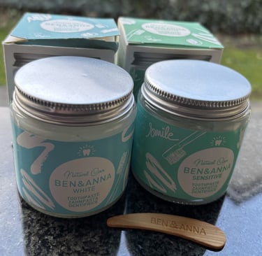 Ik gebruik hiervoor tandverzorging van Ben & Anna, een merk dat goed aansluit bij mijn visie op bewuste verzorging. De verpakking is plasticvrij aangezien de tandpasta in een glazen pot zit en met het houten spateltje breng je gemakkelijk de juiste hoeveelheid aan op je tandenborstel.